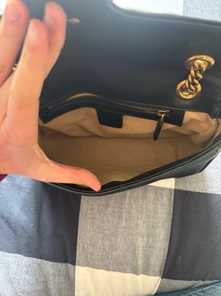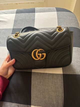 Elegante bolso Gucci Marmont en color negro. Un clásico que aporta estilo a cualquier look. - Diseño acolchado Chevron. - Detalle de doble G en dorado. - Cadena metálica dorada. Usado en pocas ocasiones.