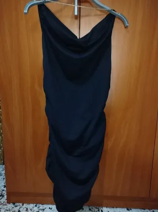 Vestido elegante de color negro con detalles de cadena. - Diseño con escote drapeado. - Abertura en la espalda. - Cadena metálica decorativa.