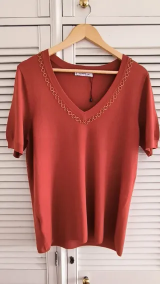 manga corta y escote de pico con aplique de cadena dorada alrededor del escote, muy original y elegante. Es un punto fino de viscosa con buena caída y que sienta muy bien además de ser muy cómodo. Ideal bajo un blazer tanto para primavera como entretiempo. Color ocre, caldera, coral oscuro. Está nuevo, Tiene una sola puesta y está lavado y planchado. Talla M de la línea Violeta de Mango que va perfecto para 42 44 y 46, según como te guste llevarlo más suelto o ajustadito. #pull #jersey #sueter #sweater #haut #top #fino #caldera #ocre #naranja #oscuro #calido # cadena #dorada #escote #pico #manchescourtes #shortsleeves #manga #corta
