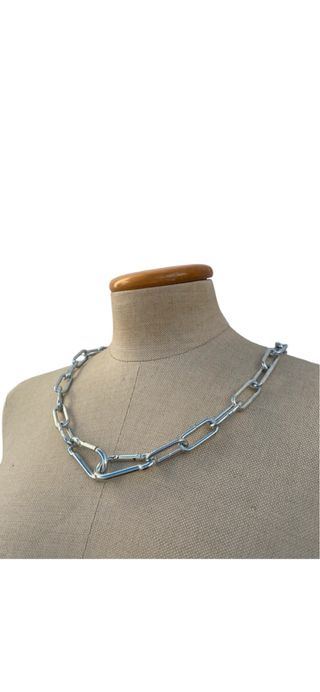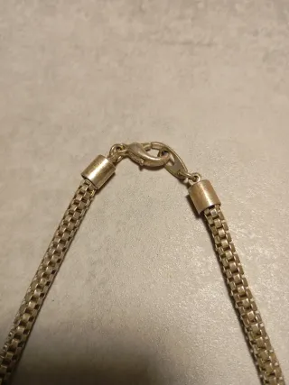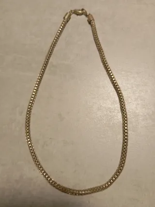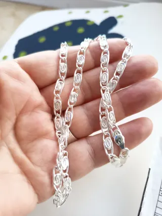 Elegante cadena de collar con un diseño de eslabones entrelazados. - Acabado metálico brillante. - Estilo clásico y versátil. - No se de que material es pero lleva conmigo 5 meses metida en un cajon y esta como nueva - Tampoco se la marca pero es del ex de una amiga