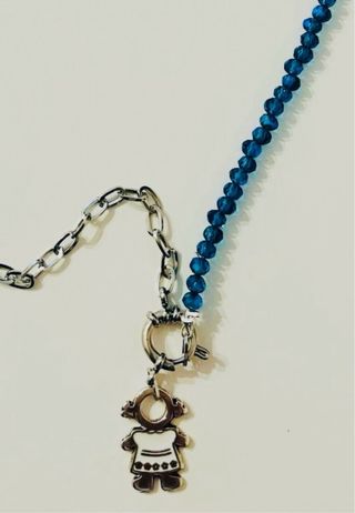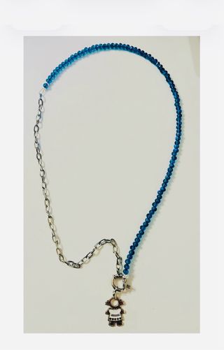 Collar con cadena de eslabones plateados y una hilera de cuentas azules. Incluye un colgante con la figura de una niña. - Cierre de mosquetón. - Diseño único y moderno.