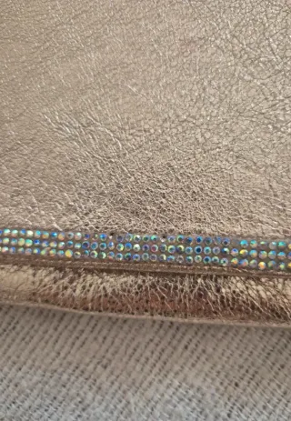 Elegante bolso de mano Lodi. - Confeccionado en piel. - Acabado metalizado dorado. - Detalle de pedrería en la solapa. - Incluye cadena dorada para llevar al hombro. Usado solo para un evento Le faltan dos piedrecitas pero al ser tan pequeñas no se aprecia, hay fotos puestas. Medidas 23cm X 13cm Cadena desmontable Se entrega con bolsa guardapolvo