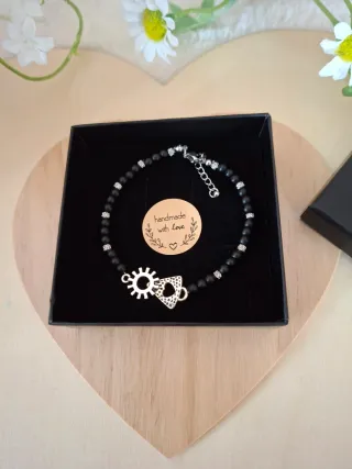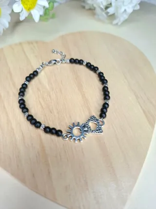 Pulsera de cuentas de piedra natural ÓNIX con colgante de ACERO de la Virgen del Pilar. Cierre de mosquetón con cadena de ajuste, y cuentas separadoras de acero. Joyería artesanal, máxima calidad y diseño único. Nuevo, en su cajita para regalar.