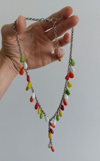Está nuevo. Nunca usado. La cadena es de color plata pero no es plata. Es bisutería. Y las cuentas son piedras de colores con brillo y de colores en forma de lágrimas.