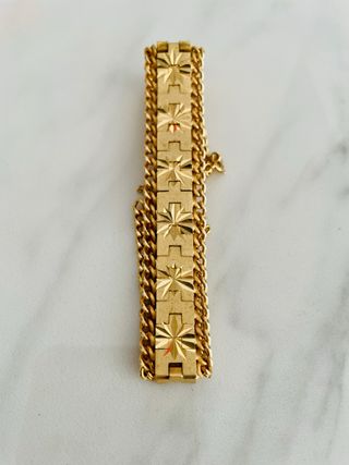 Elegante pulsera de estilo vintage con un diseño único. - Acabado bañado en oro. - Diseño con eslabones y detalles grabados. - Cadena adicional.