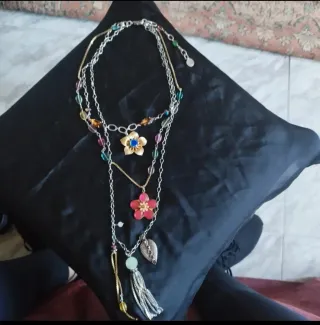Collar de varias cadenas con un diseño floral y adornos de cuentas de colores. - Dos colgantes de flor, uno dorado con centro azul y otro rosa. - Cuentas de cristal en tonos verdes, azules, naranjas y morados. - Detalle de hoja y borla plateada. - Cadena fina dorada y plateada.