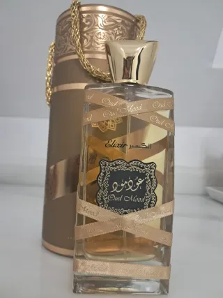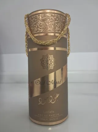 Este es un perfume Oud Mood de Lattafa. - Presentación en frasco cilíndrico. - Diseño con detalles dorados y motivos ornamentales. - Incluye una cadena dorada decorativa. - Contenido: 100ml / 3.4 FL.OZ.