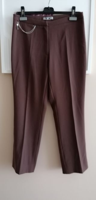 Pantalón capri de color marrón, con un diseño moderno y elegante. - Detalle de cadena decorativa en la cintura. - Corte capri, ideal para climas cálidos. - Tejido de calidad con caída.