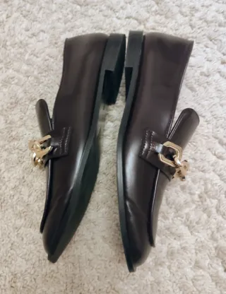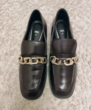 Mocasines de Zara con un diseño elegante y moderno. - Fabricados en piel sintética. - Detalle de cadena dorada en la pala. - Color marrón oscuro.