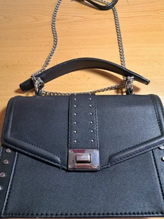Elegante bolso de hombro con un diseño moderno y detalles metálicos. - Asa corta superior. - Correa larga de cadena. - Cierre de solapa con broche metálico. - Adornado con tachuelas plateadas.