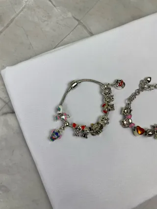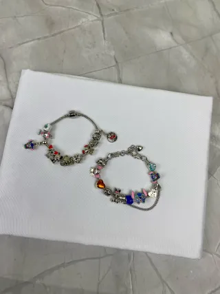 Conjunto de dos pulseras con charms de Disney. - Diseño con múltiples figuras. - Cadena plateada.