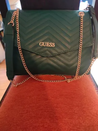 Elegante bolso Guess con un diseño acolchado en zigzag. La cadena dorada le da un toque sofisticado. - Color verde intenso. - Cadena metálica dorada.