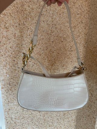Bolso de mano con un diseño elegante y moderno. - Acabado texturizado tipo piel de cocodrilo. - Asa con detalle de cadena dorada. - Color blanco. Trae dos correas, una más corta para colgar en el hombro y otra más larga para colgarlo como un bolso normal.