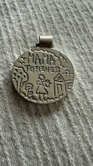 Colgante de plata con un diseño grabado. - Grabado Mama Forever. - Ilustración de una casa, un árbol y una figura. - Cierre para cadena.