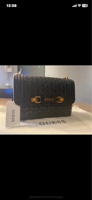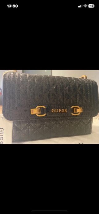 Elegante bolso Guess con un acabado brillante y detalles dorados. Perfecto para añadir un toque de glamour a cualquier atuendo. - Diseño acolchado. - Cierre con solapa. - Cadena dorada para llevar al hombro o cruzado.
