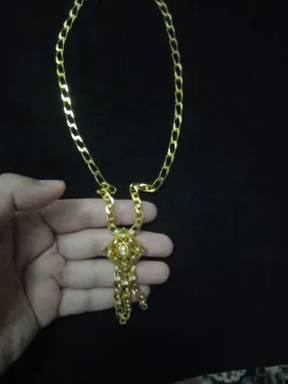 Elegante collar vintage con un diseño único. - Cadena dorada. - Colgante con forma de rombo y detalles. - Adorno de flecos en la parte inferior del colgante.
