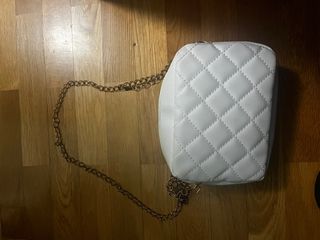 Bolso de mano blanco con un diseño acolchado y detalles metálicos. - Material: imitación de cuero. - Cierre de cremallera. - Correa de cadena. - Adorno de ala metálica en la parte frontal. Sin usar.