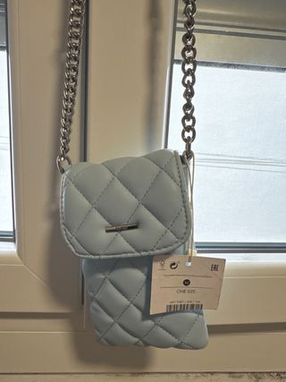 Elegante bolso de Zara con un diseño acolchado y detalles de cadena. - Diseño acolchado con patrón de rombos. - Ribete blanco en los bordes. - Asa de cadena metálica plateada.