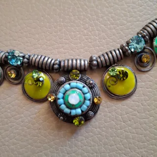 Collar con un diseño llamativo y adornos. - Detalle de piedras en tonos verdes y turquesas. - Elementos circulares y espirales. - Cadena con eslabones texturizados.