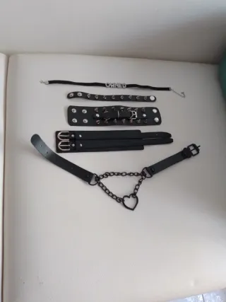 Conjunto de accesorios estilo punk. - Gargantilla con letras OWNED. - Pulsera con tachuelas. - Pulsera con tachuelas y hebilla. - Pulsera ancha con hebillas. - Gargantilla con cadena y corazón.