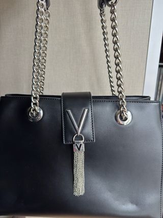 Elegante bolso de mano Mario Valentino en color negro. Cuenta con un diseño sofisticado y detalles metálicos. - Asa de mano y cadena para llevar al hombro. - Cierre con solapa y detalle de logo. - Adorno de flecos metálicos.