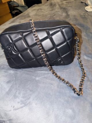 Bolso negro con un diseño acolchado y detalles de cadena. - Material exterior texturizado. - Cierre de cremallera. - Correa de cadena dorada. - Correa adicional de piel negra.
