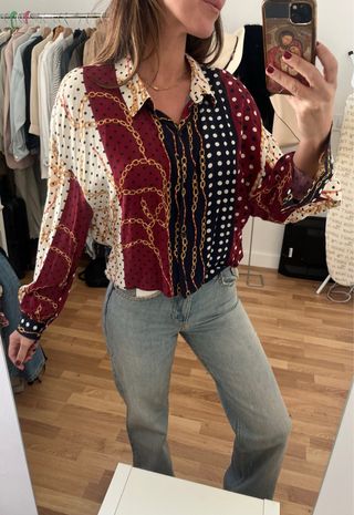 Camisa con un diseño llamativo y original. - Estampado de cadenas doradas y lunares. - Paneles de diferentes diseños. - Cuello camisero.