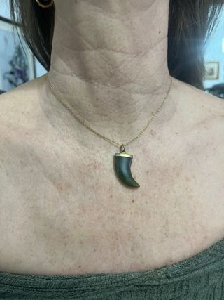 Colgante con un detalle en piedra de color verde, sujeto a una cadena dorada. - Piedra de color verde. - Cadena de tono dorado.