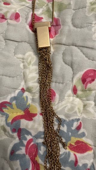 Elegante colgante de estilo vintage con un diseño de cadenas doradas y un detalle en forma de barra beige. - Cadena fina y delicada. - Colgante con acabado metálico dorado. - Elemento central en tono beige.