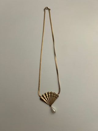 Elegante cadena de oro con un colgante en forma de abanico y una perla. - Diseño de abanico texturizado. - Colgante de perla en forma de lágrima. - 12 gramos - 14k