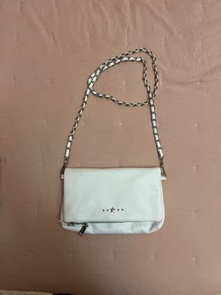 Bolso blanco con un diseño moderno y detalles únicos. - Cadena metálica para llevar al hombro. - Adornado con tachuelas en forma de estrella. - Cierre de cremallera en la parte inferior.