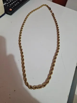 Elegante cadena de oro con un diseño trenzado que imita una soga. Su acabado brillante le da un toque de distinción. - Material: Oro - Diseño: Estilo soga trenzada