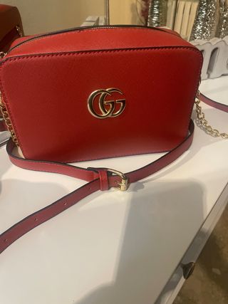 Elegante bolso de mano en color rojo burdeos. - Diseño con logo GG dorado. - Correa de cadena dorada. - Correa de hombro ajustable.