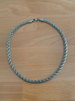 Elegante collar de metal con un diseño trenzado. Su acabado plateado le da un toque moderno. - Diseño de cadena trenzada. - Cierre de mosquetón.