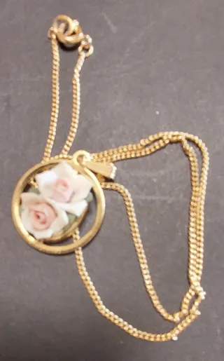 Precioso colgante con un diseño delicado de rosas de porcelana y una cadena. - Colgante con dos rosas en tonos rosados y blancos. - Marco circular dorado. - Cadena fina y brillante.