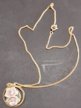 Colgante con rosas porcelana y cadena dorada.