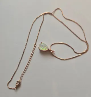 Elegante colgante con una piedra de ópalo en forma de lágrima, engarzado en chapado color oro. - Piedra principal: Ópalo. - Forma de la piedra: Lágrima. - Tipo de cierre: Mosquetón.