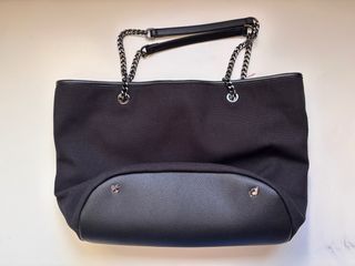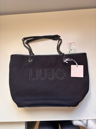 Elegante bolso tote de la marca Liu Jo en color negro. Un accesorio versátil y moderno. - 31/40 x 28 x 20 - Diseño con el logo de la marca adornado con pedrería. - Asas de cadena y piel. - Incluye etiqueta original. CON SACO PROTECTOR ORIGINAL Y LENTEJUELAS DE RECAMBIO