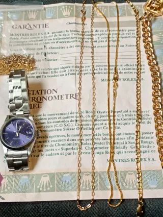 Reloj automático de 36 mm con esfera lila, movimiento mecánico y brazalete metálico. Estética elegante tipo reloj de lujo. Se vende junto con varias cadenas y pulsera doradas, ideales para uso diario o para combinar. Estado: buen estado general, funcionando correctamente. Venta en mano o envío.