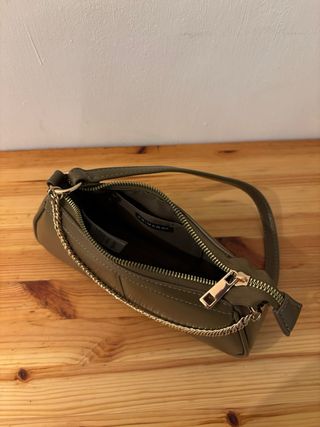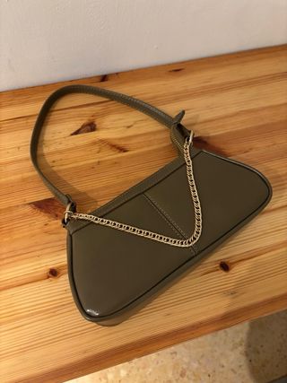 Pequeño bolso de hombro color verde oliva y con detalle de cadena color dorado. No se ha usado nunca y está en perfecto estado.