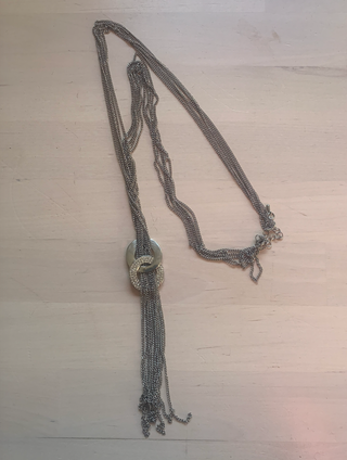 Collar de bisutería en tono plateado compuesto por varias cadenas finas unidas a un colgante central formado por dos piezas circulares superpuestas, una lisa y otra con pequeños cristales incrustados. En la parte inferior cuelgan varias cadenas sueltas a modo de flecos. Dispone de cierre de mosquetón con cadena extensible para ajustar la longitud. Presenta uso leve con pequeñas marcas superficiales propias del roce, sin roturas visibles ni pérdidas apreciables de brillo en las piezas metálicas.