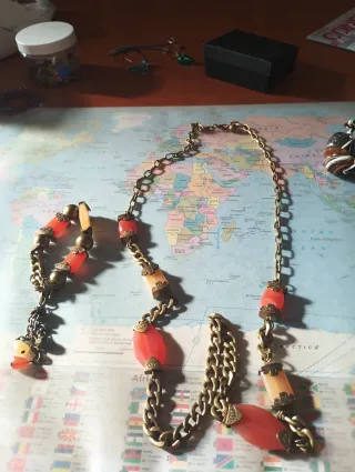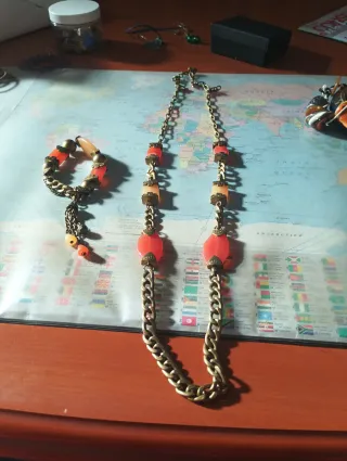 Conjunto de collar y pulsera con un diseño llamativo. - Collar con cadena dorada y cuentas de resina en tonos naranjas y melocotón. - Pulsera a juego con cuentas similares y un pequeño adorno de patito. - Cierre de mosquetón en el collar.