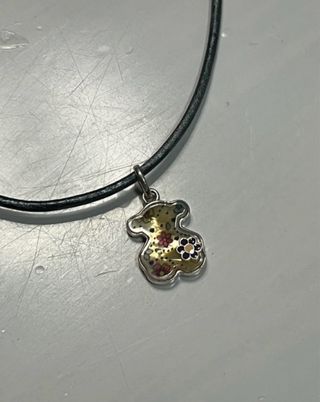 Collar con colgante de oso de la marca Tous. El diseño del colgante es muy original y llamativo. - Colgante con forma de oso. - Diseño con motivos florales. - Cadena de cuero negra.