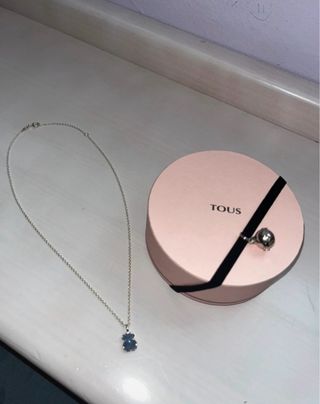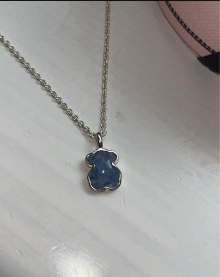 Collar de la marca Tous con un colgante en forma de oso. El diseño combina detalles en color azul y plata. - Colgante con forma de oso. - Cadena fina de plata.