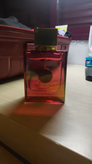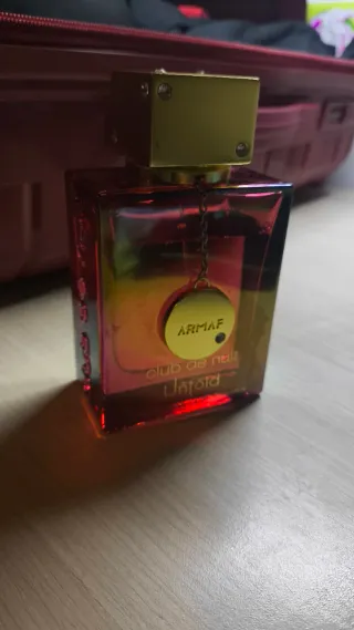 Este es el perfume Club de Nuit Untold de Armaf. - Botella con acabado degradado en tonos dorados y rojizos. - Detalle de cadena dorada con medallón. - Tapa dorada con remaches.