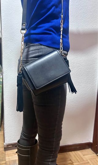 Bolso pequeño de la marca Zara. - Diseño elegante y moderno. - Cadena dorada. - Adornos de flecos. En perfecto estado y usado en dos ocasiones . Color negro con cadena dorada