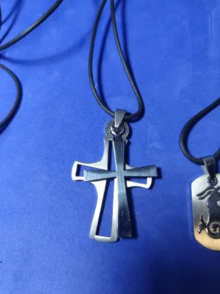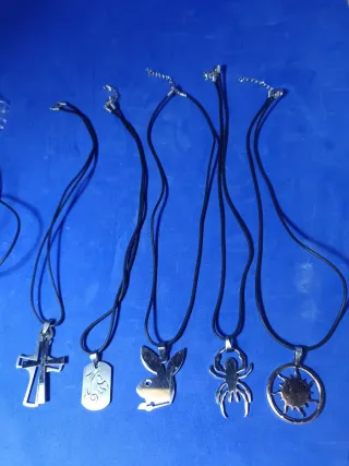 Conjunto de cinco colgantes con cordón de acero. - Colgante de cruz - Colgante de placa con diseño - Colgante de conejo - Colgante de araña - Colgante de sol