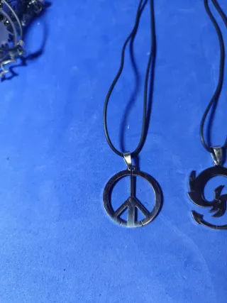 Conjunto de cinco colgantes con diferentes diseños. - Colgante con símbolo de la paz. - Colgante con diseño tribal. - Colgante con forma de cruz. - Colgante de calavera con huesos cruzados. - Colgante con silueta de ave.