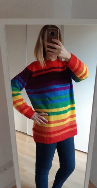 Jersey naranja de punto con cuello alto talla S/M. Se encuentra en perfecto estado ya que solo tiene 1 puesta. - Tejido suave y cómodo. - Diseño clásico y versátil.