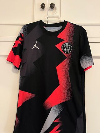 Camiseta original del Paris Saint-Germain (PSG) de la colección Jordan, modelo prepartido. - Diseño con bloques de color y detalles gráficos. - Logo de Jordan y escudo del PSG. - Mangas cortas.